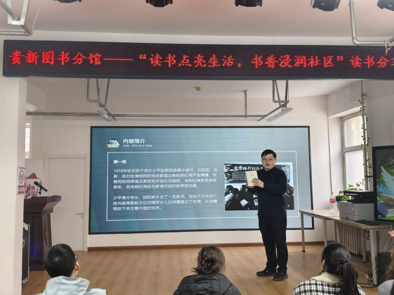 4月16日,yl23455永利集团选派员工参加贵新社区“读书点亮生活,书香浸润社区”读书分享会,与校内外各学院同学共话阅读、分享感悟。沙一凡同学带来了《乡土中国》的分享,带领大家重新认识了我们脚下这片土地的文化根脉;张博文同学则分享了《平凡的世界》,讲述了普通人在时代历史进程中所走过的艰难曲折的道路,让在场的每一个人都深受触动。